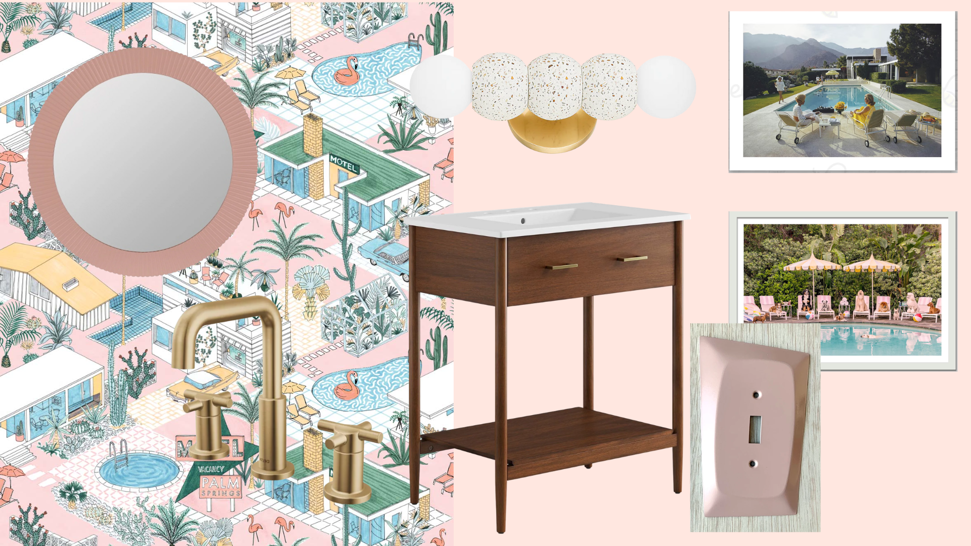 Did you know Palm Springs became a mid-century modern hub as Hollywood stars and architects flocked there? The historic preservation and year-round sunshine have kept these iconic buildings pristine - and is one of my favorite places in the US! This jewel box powder room is a playful, maximalist design with a retro Palm Springs vibe. The star of the show is the whimsical wallpaper depicting mid-century modern design scene with cacti, palm trees, and swimming pools. Curious about the why behind the specific design choices? Well, The arched mirror in a pink frame echoes the peachy tones in the wallpaper and adds architectural interest. The terrazzo and globe lights sconce is emblematic of mid-century modern design. The brass fixtures provide warm metallic accents, while the atomic switchplate, the striped hand towel pulls colors directly from the wallpaper, tying everything together. The overall effect is joyful and unapologetic!